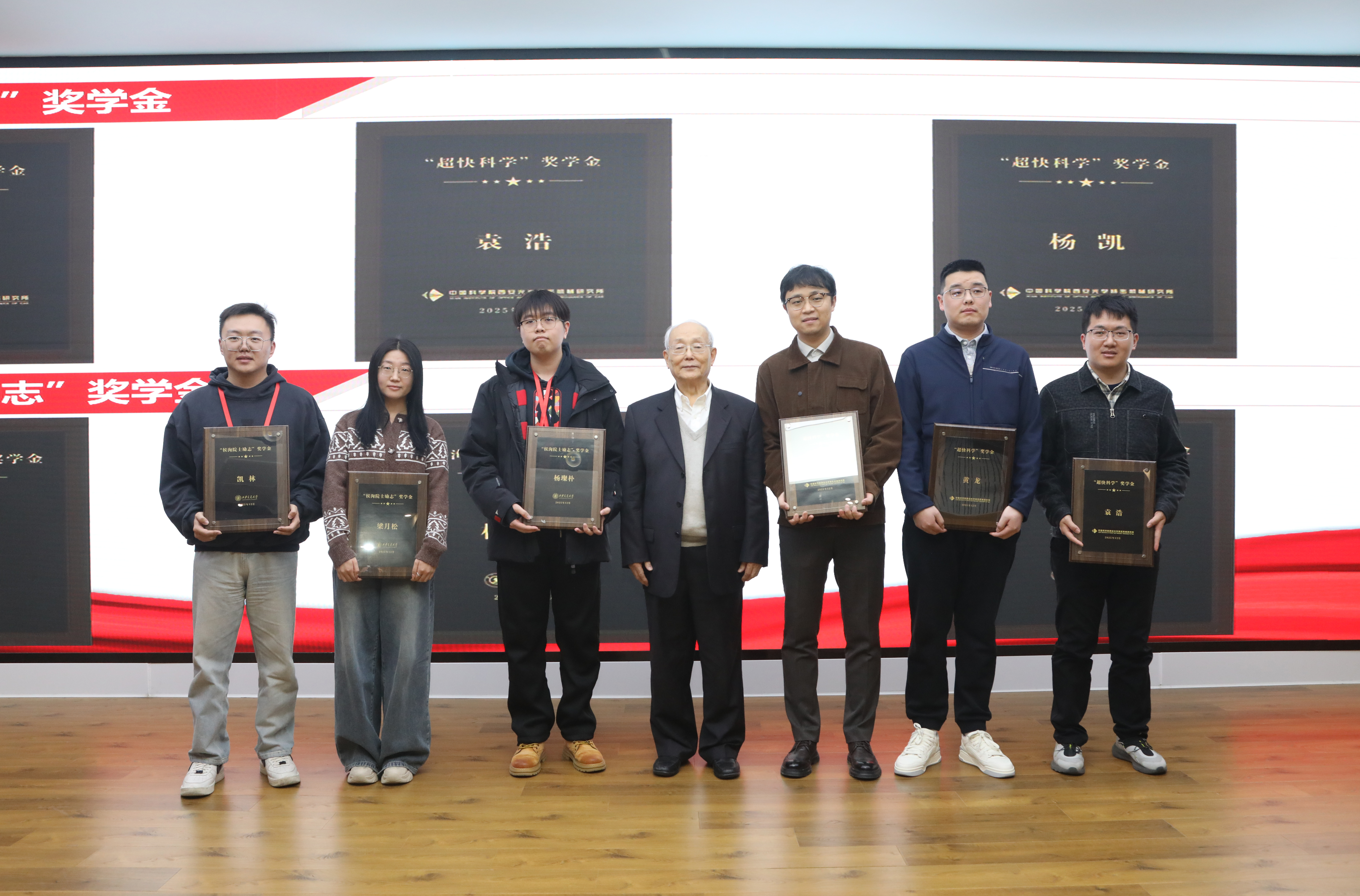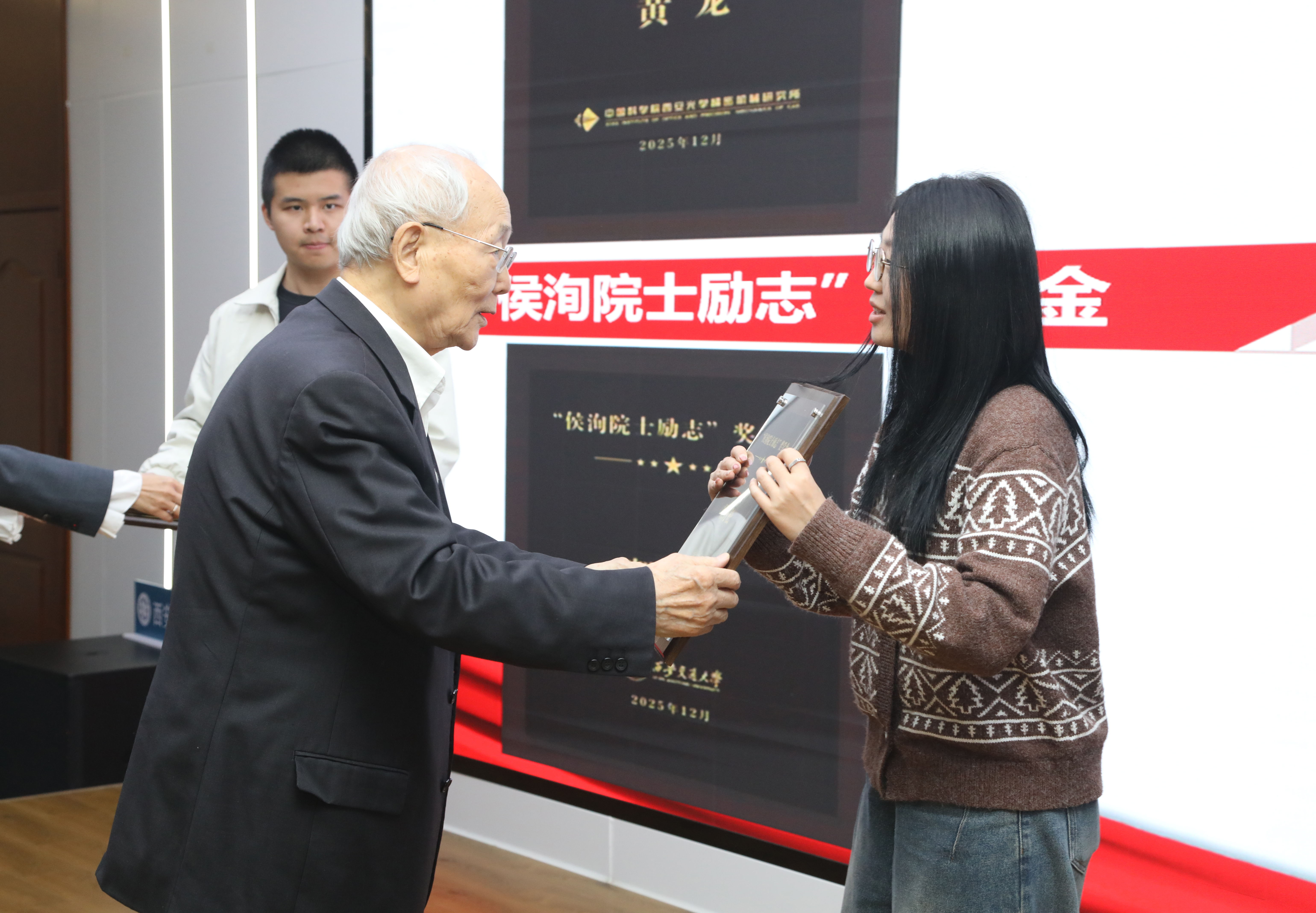 圖 侯洵院士為“超快科學(xué)獎(jiǎng)學(xué)金”“侯洵院士勵(lì)志獎(jiǎng)學(xué)金”獲獎(jiǎng)學(xué)生頒獎(jiǎng)
